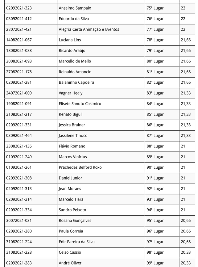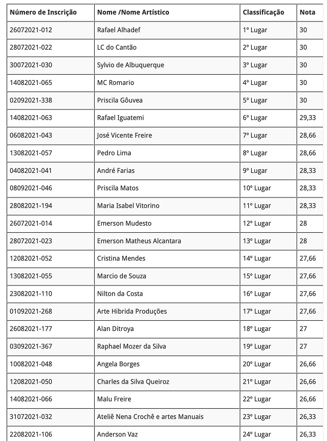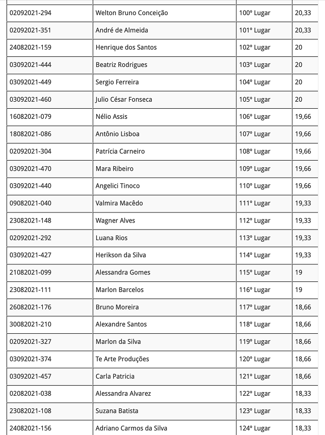 Atenção! O prazo de entrega de documentos dos reclassificados será do dia 13/10/21 até o dia 14/10/21 de 9h às 17h na Secretaria Municipal de Cultura.